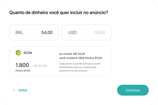 Você define seu orçamento em reais (ou dólares), e o sistema converte automaticamente em Pontos ECOA, ao custo fixo de R$ 0,03 por ponto.